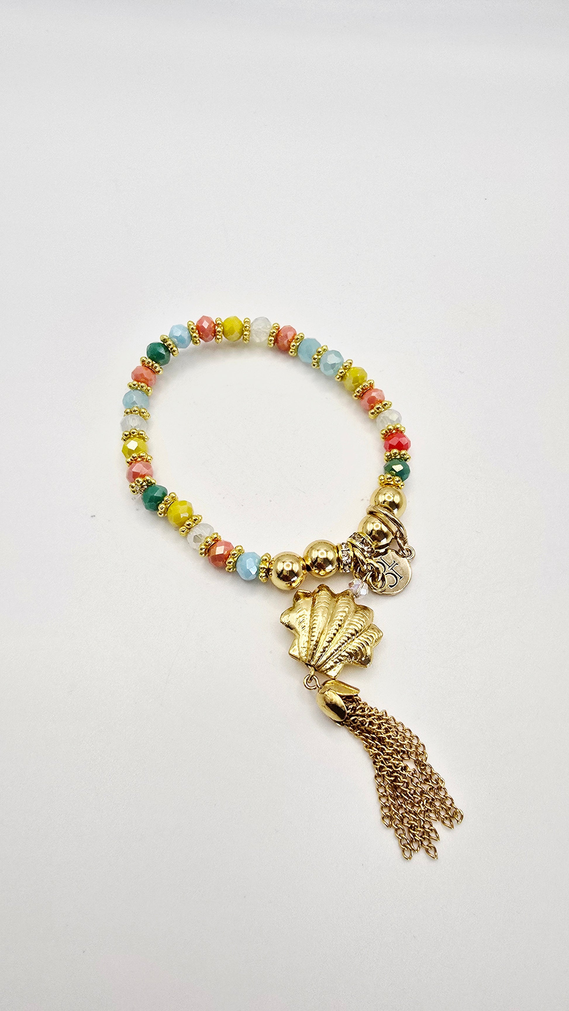 The Cruz Charm Tassel Bracelet is coastal luxe with a modern edge. Vibrant faceted beads in coral, aqua, lemon, and jade are threaded with polished gold accents, bringing a playful pop of colour to your stack. At the centre, a sculptural gold seashell charm drops into a sleek tassel, creating effortless movement and glam.