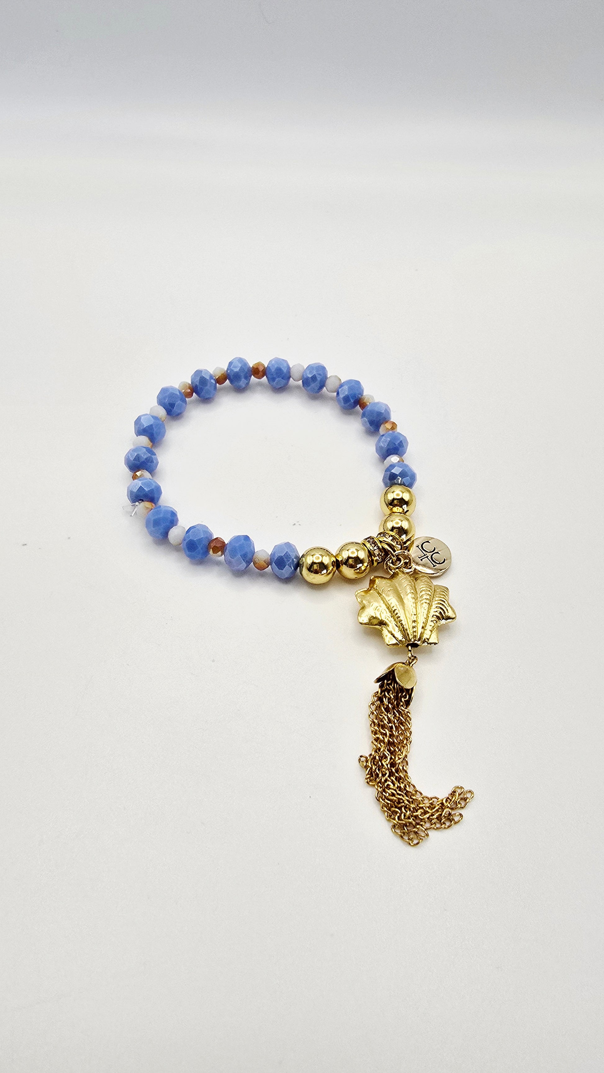 The sculptural gold seashell charm and fluid tassel add movement and statement shine, while polished gold spheres and the signature Chrissy L. tag complete the look. A stretch fit makes it effortless to wear, from day to night.