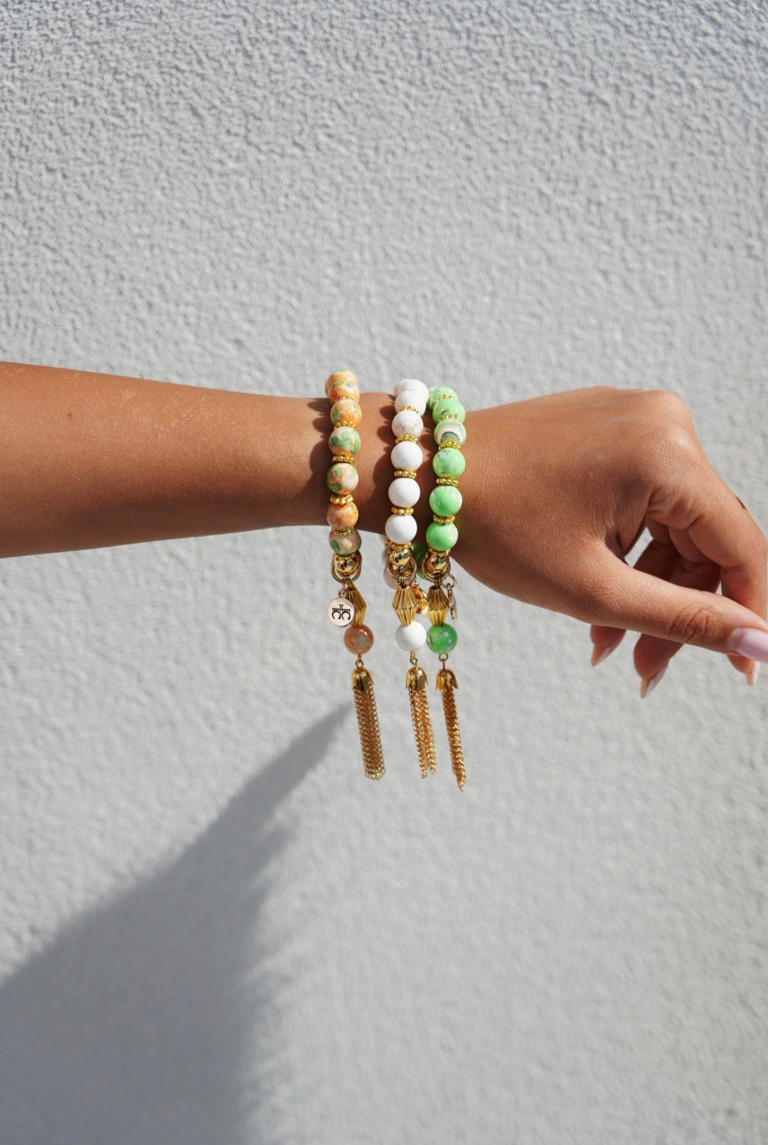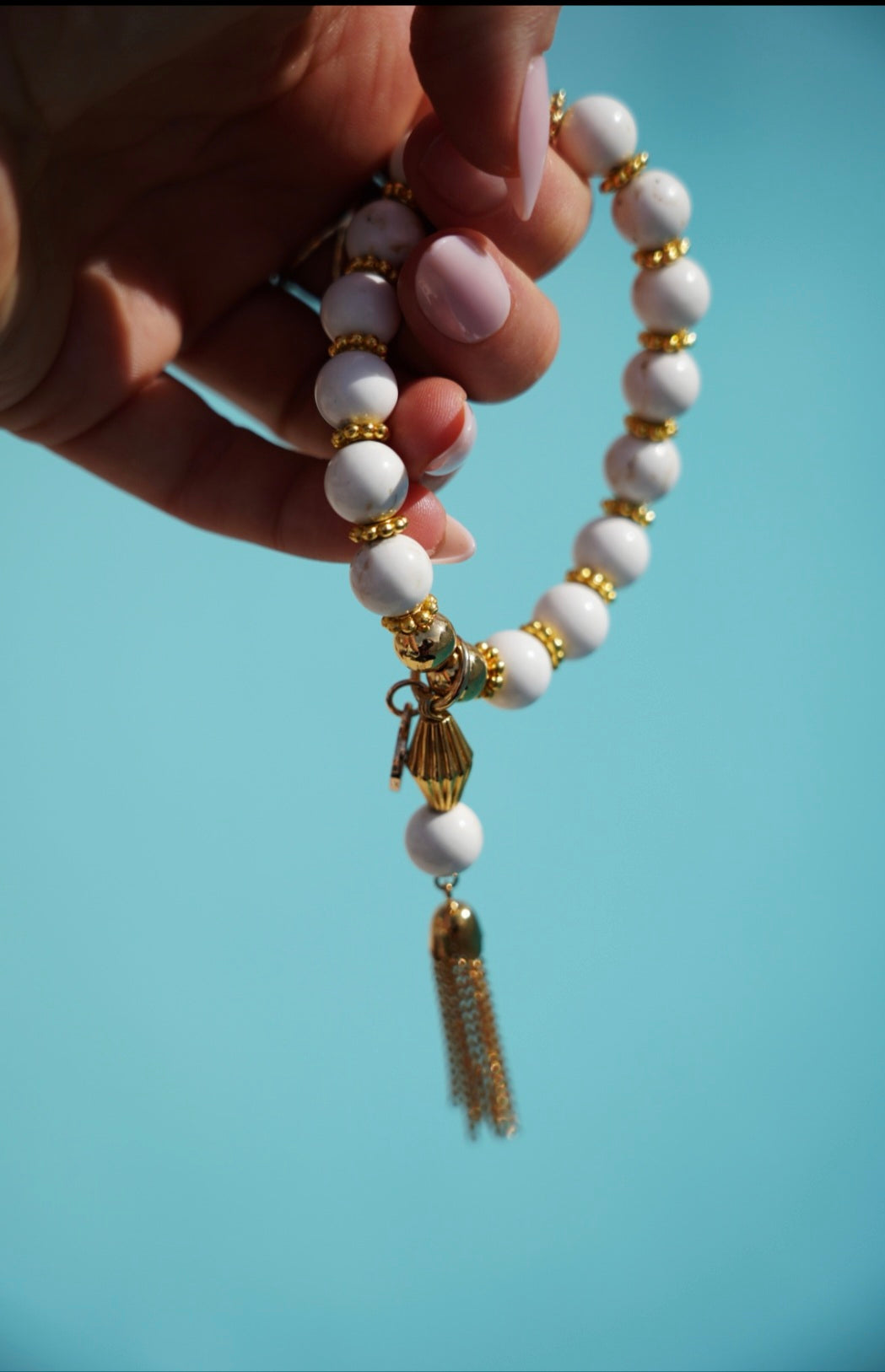 The Cruz Charm White Bracelet is sleek, minimal, and made to elevate any summer look. With polished white faux howlite marbled beads and luxe gold accents, it’s crisp and modern—perfect for sunlit terraces and late-night cocktails.