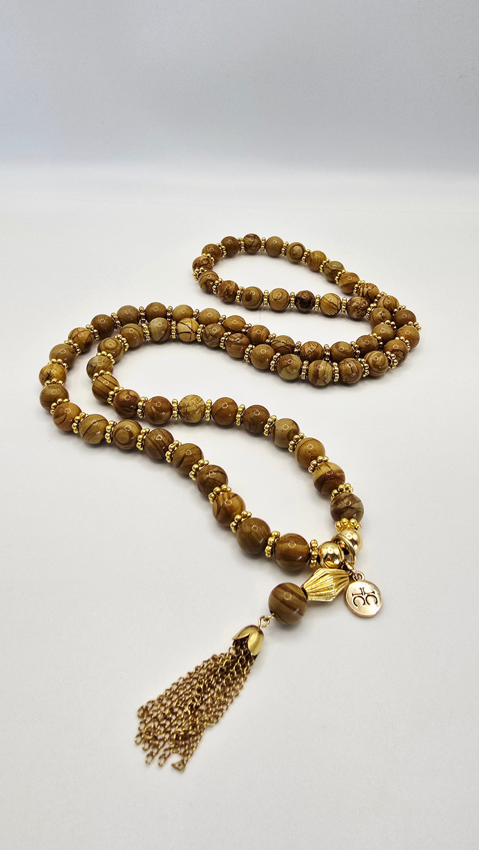 The Cruz Charm Caramel Necklace brings warmth and edge in one bold design. Crafted with smooth caramel-toned faux sandstone beads and golden accents, it’s a modern statement piece with rich, earthy undertones.