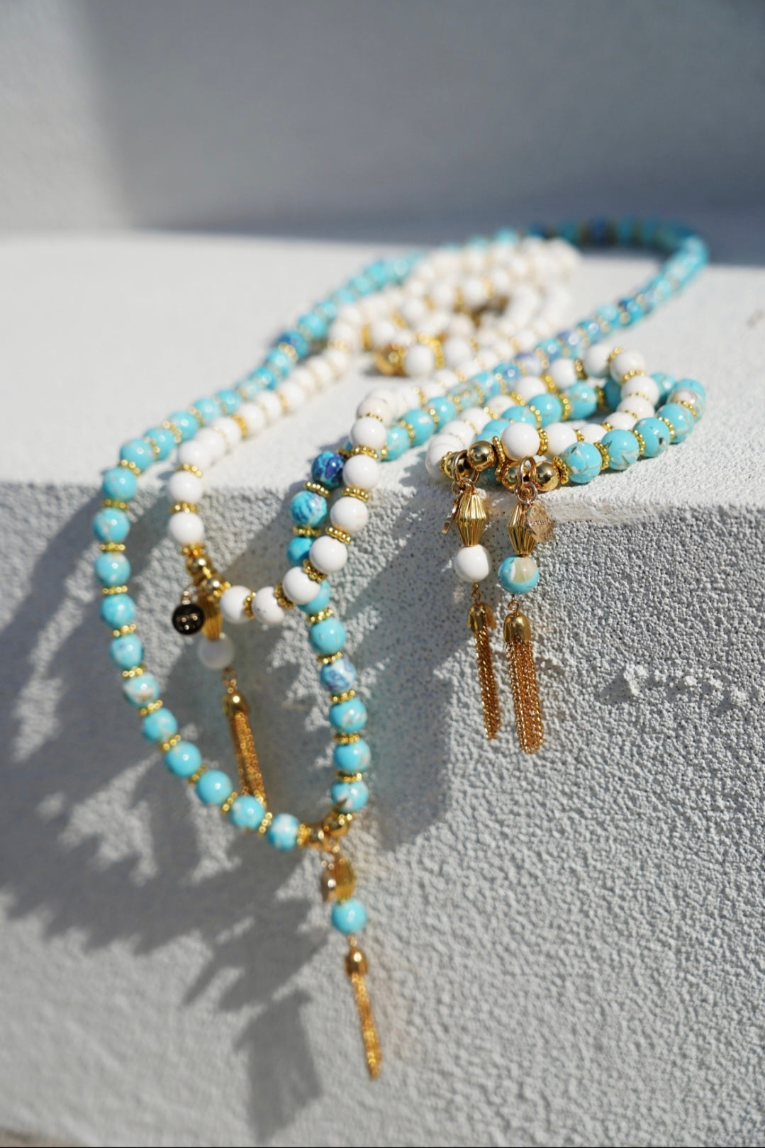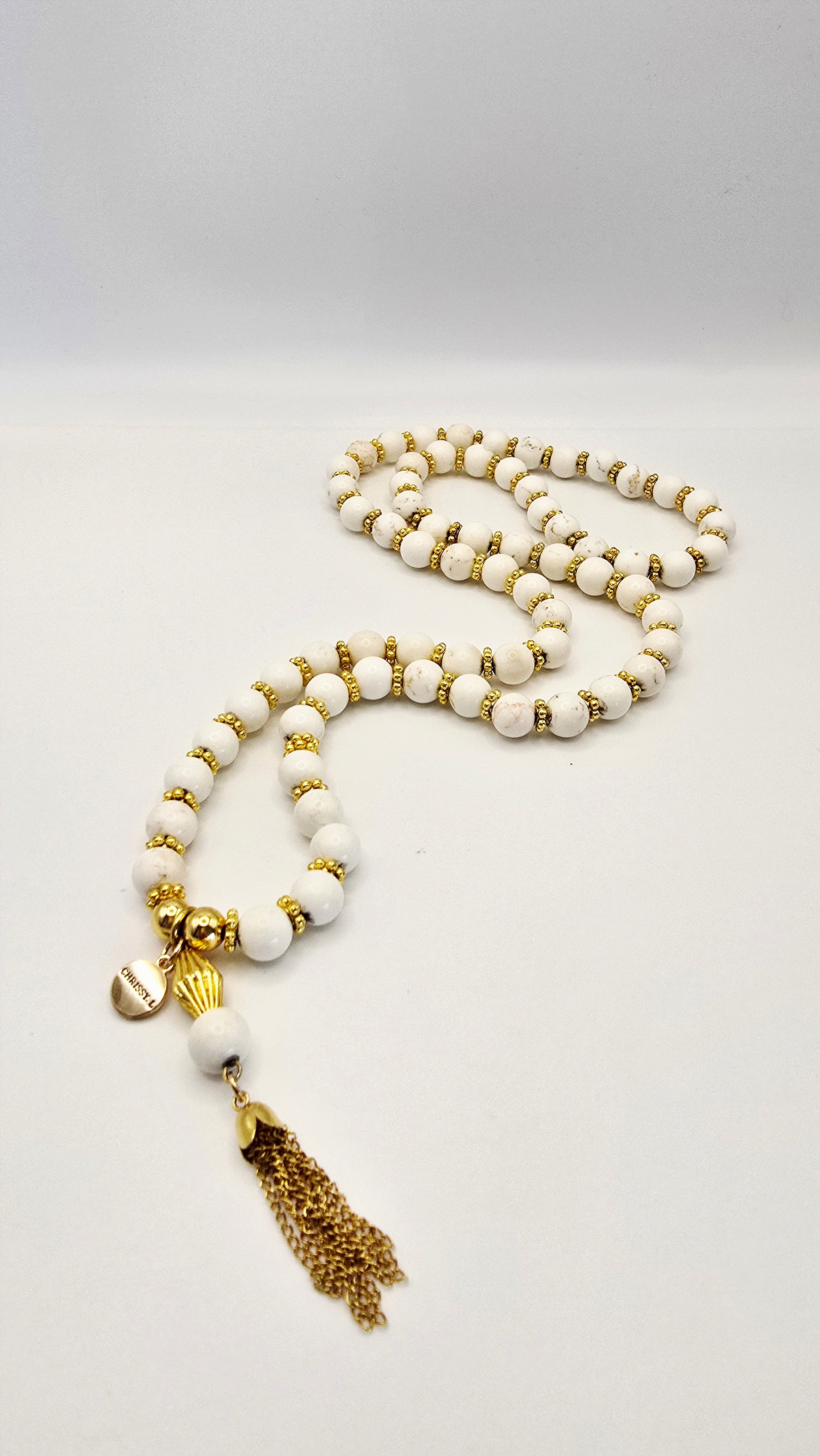 The Cruz Charm White Necklace is the definition of coastal chic. Smooth white faux howlite beads are paired with polished gold accents, creating a clean, luminous look that feels straight out of the Mediterranean. Easy to wear stretch necklace.