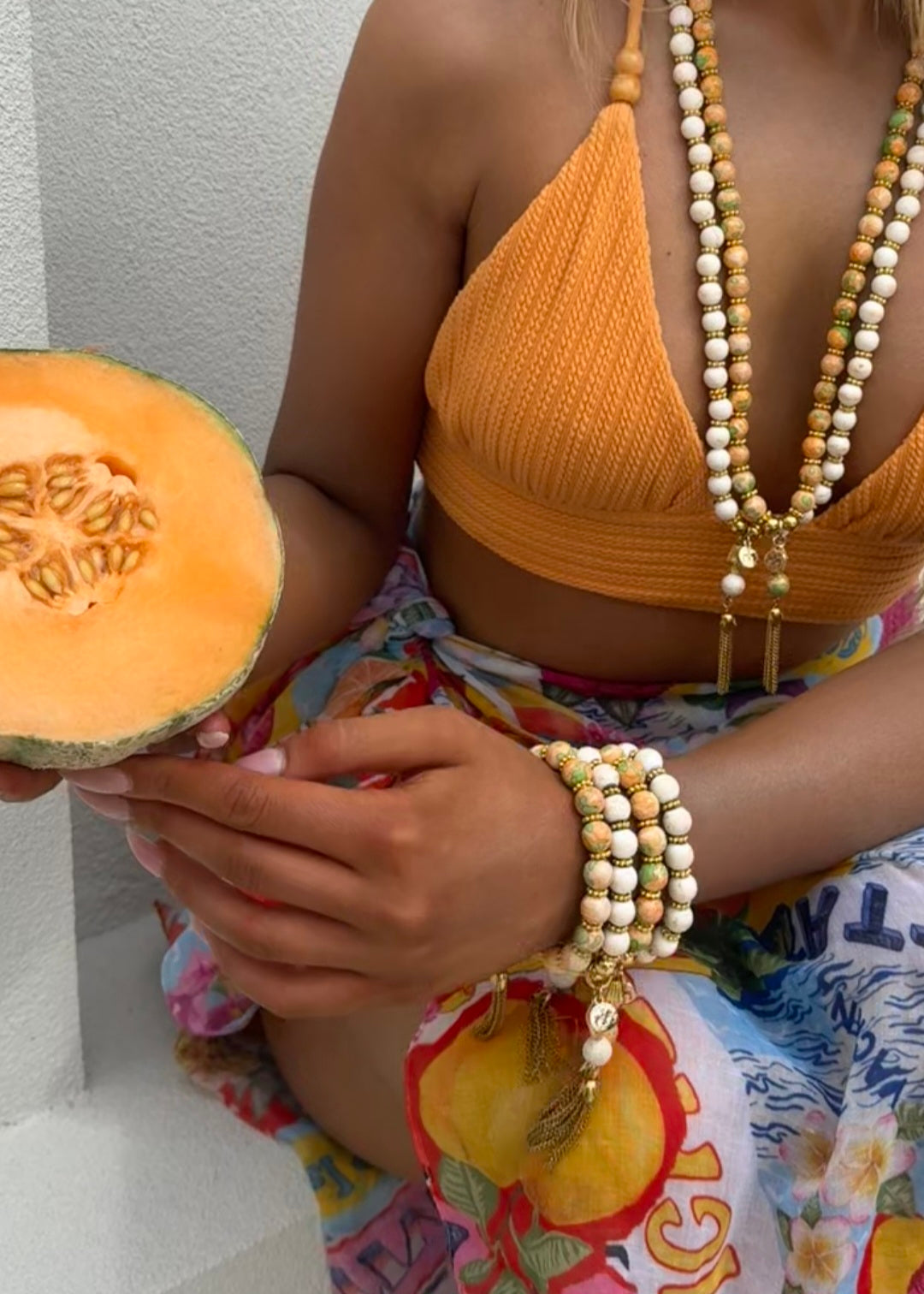 A sculptural gold shell charm and cascading tassel add movement and shine, while the signature Chrissy L. tag gives it that luxe finishing touch. Longline and versatile, this necklace is designed to carry you from breezy beach days to glamorous summer nights.
