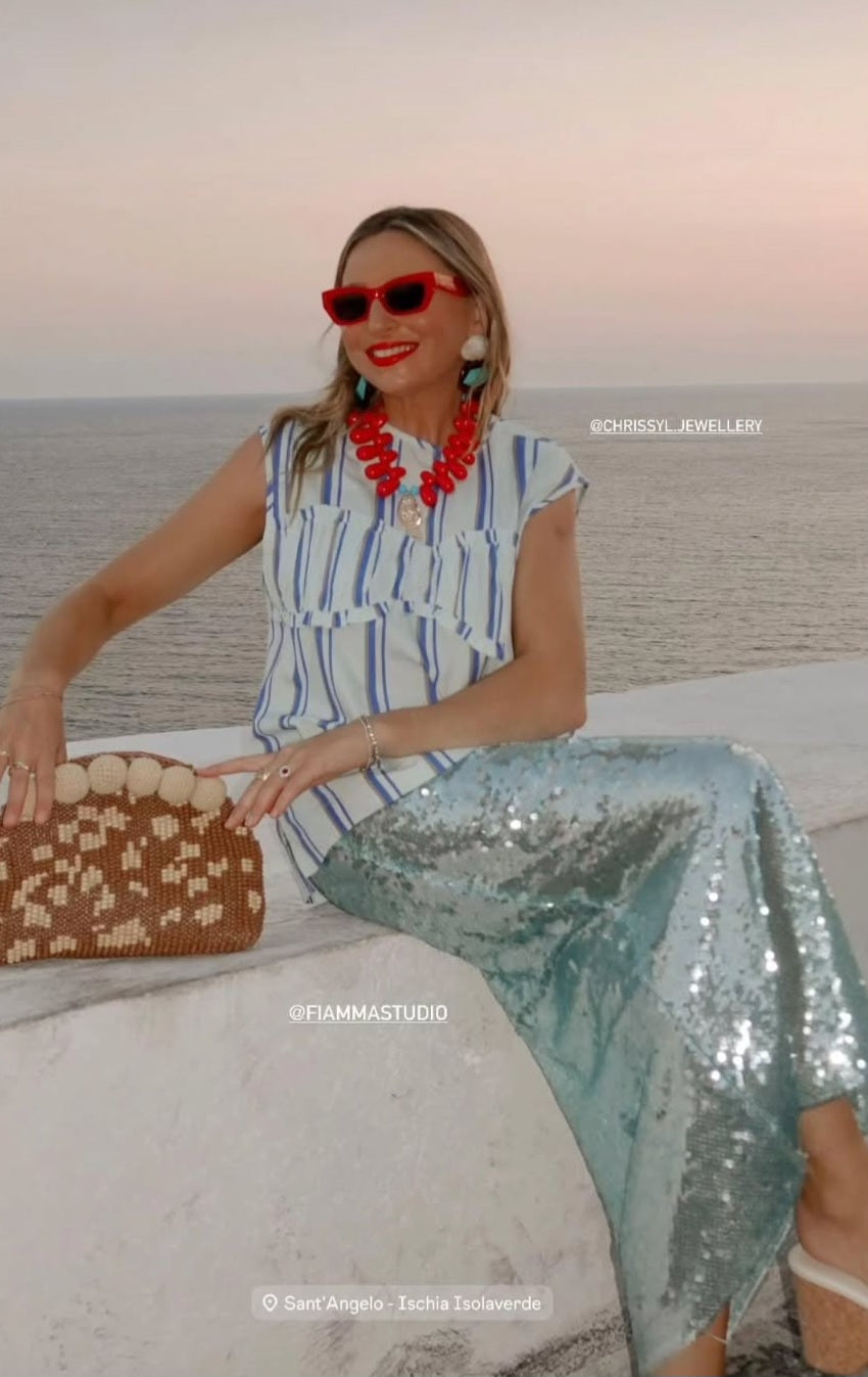 Sun-drenched drama meets coastal luxury. The Eternal Red necklace is a bold collision of oversized red teardrops and a dazzling gold fish charm, perched right where the neckline needs a little chaos. Inspired by Mediterranean summers and unapologetic glamour, this piece isn’t here to whisper.