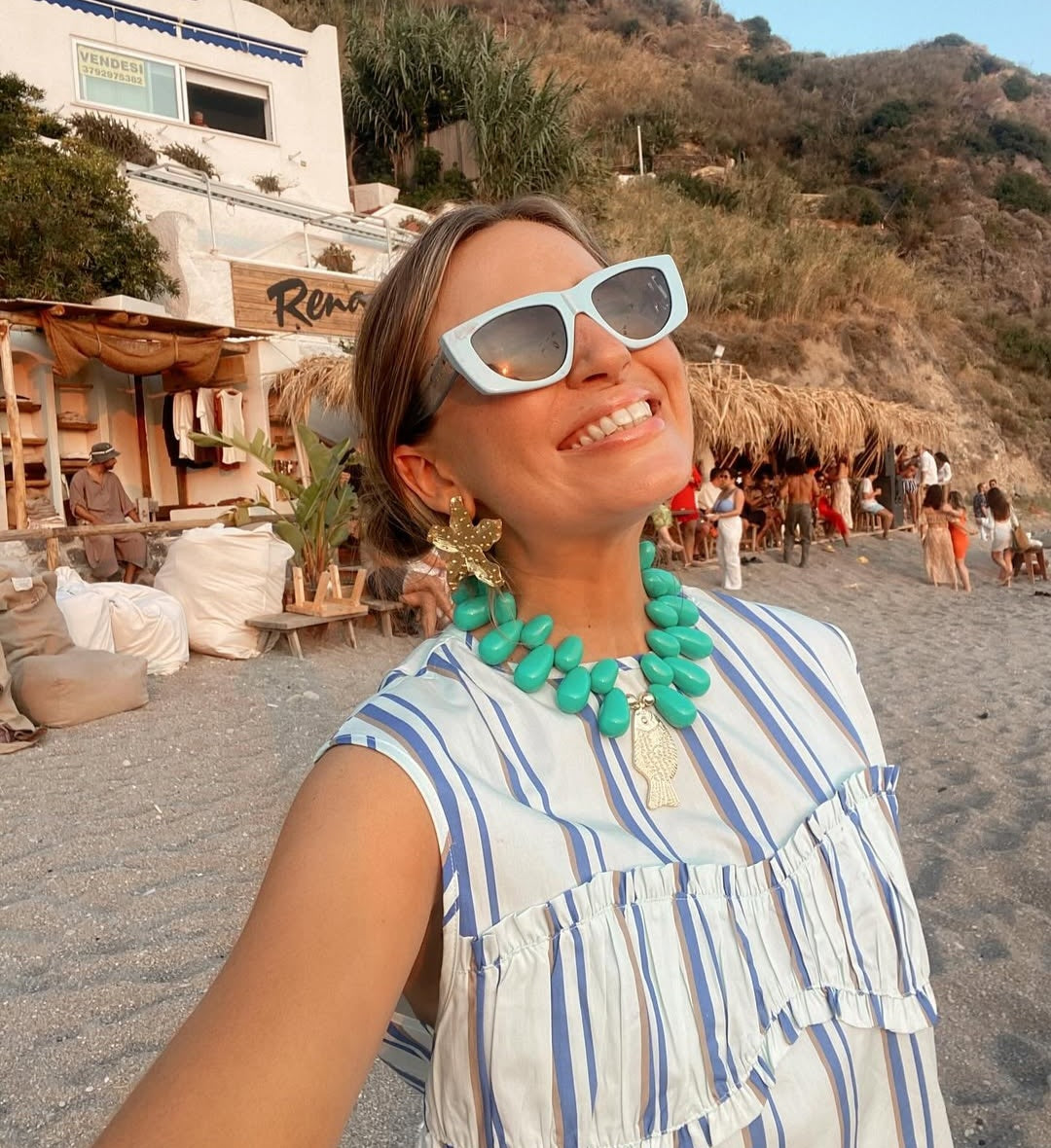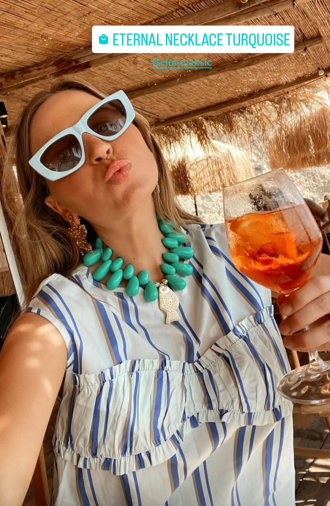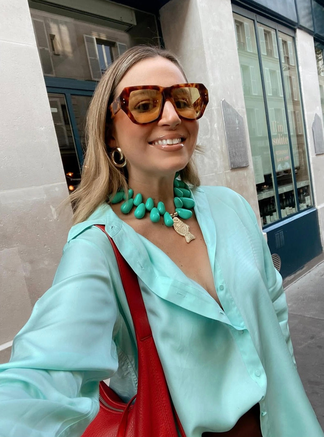 Sun-drenched drama meets coastal luxury. The Eternal Turquoise necklace is a bold collision of oversized turquoise teardrops and a dazzling gold  fish charm, perched right where the neckline needs a little chaos. Inspired by Mediterranean summers and unapologetic glamour, this piece isn’t here to whisper.