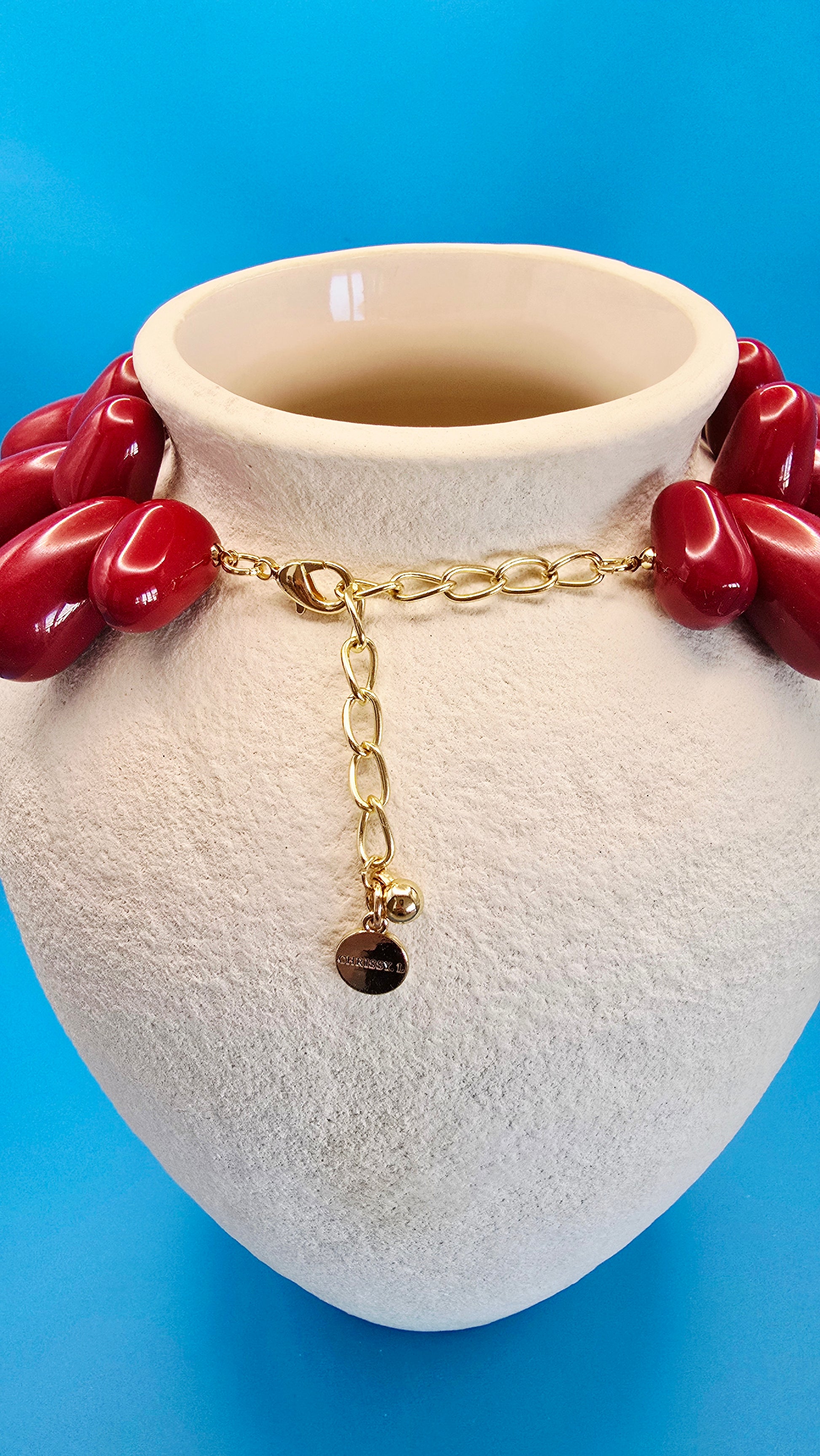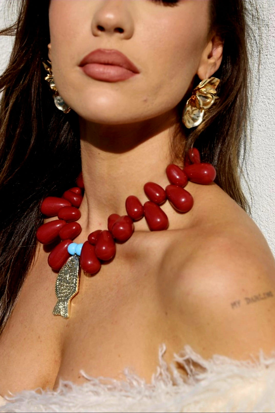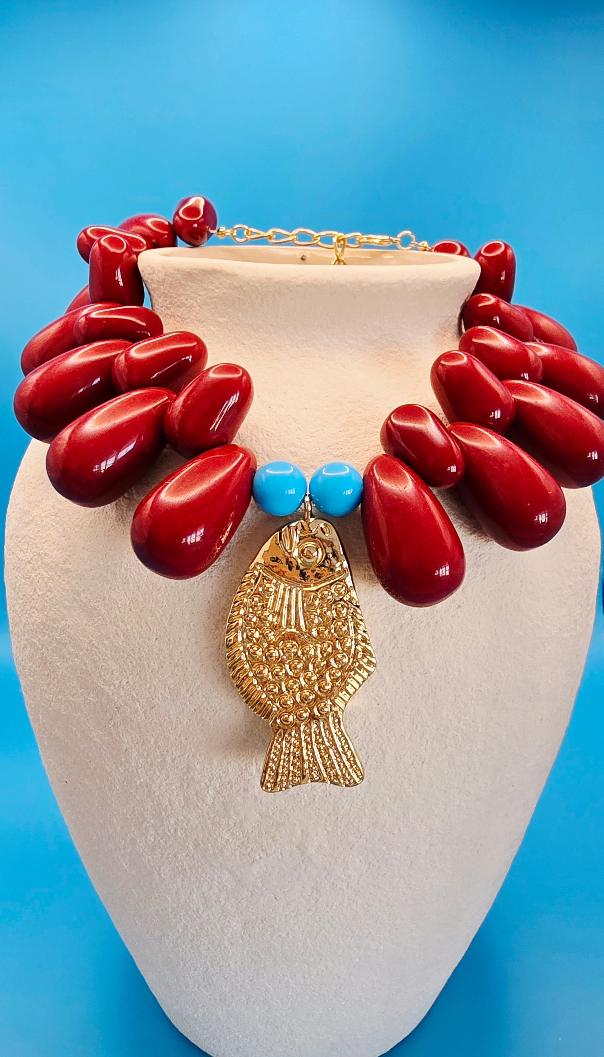 Bold. Decadent. Unforgettable. The ETERNAL WINE Necklace is a deep dive into drama—featuring rich burgundy resin beads, vibrant turquoise accents, and a hammered gold fish pendant that brings a splash of coastal soul. She’s a sunset aperitivo in necklace form: strong, sensual, and made to be noticed.