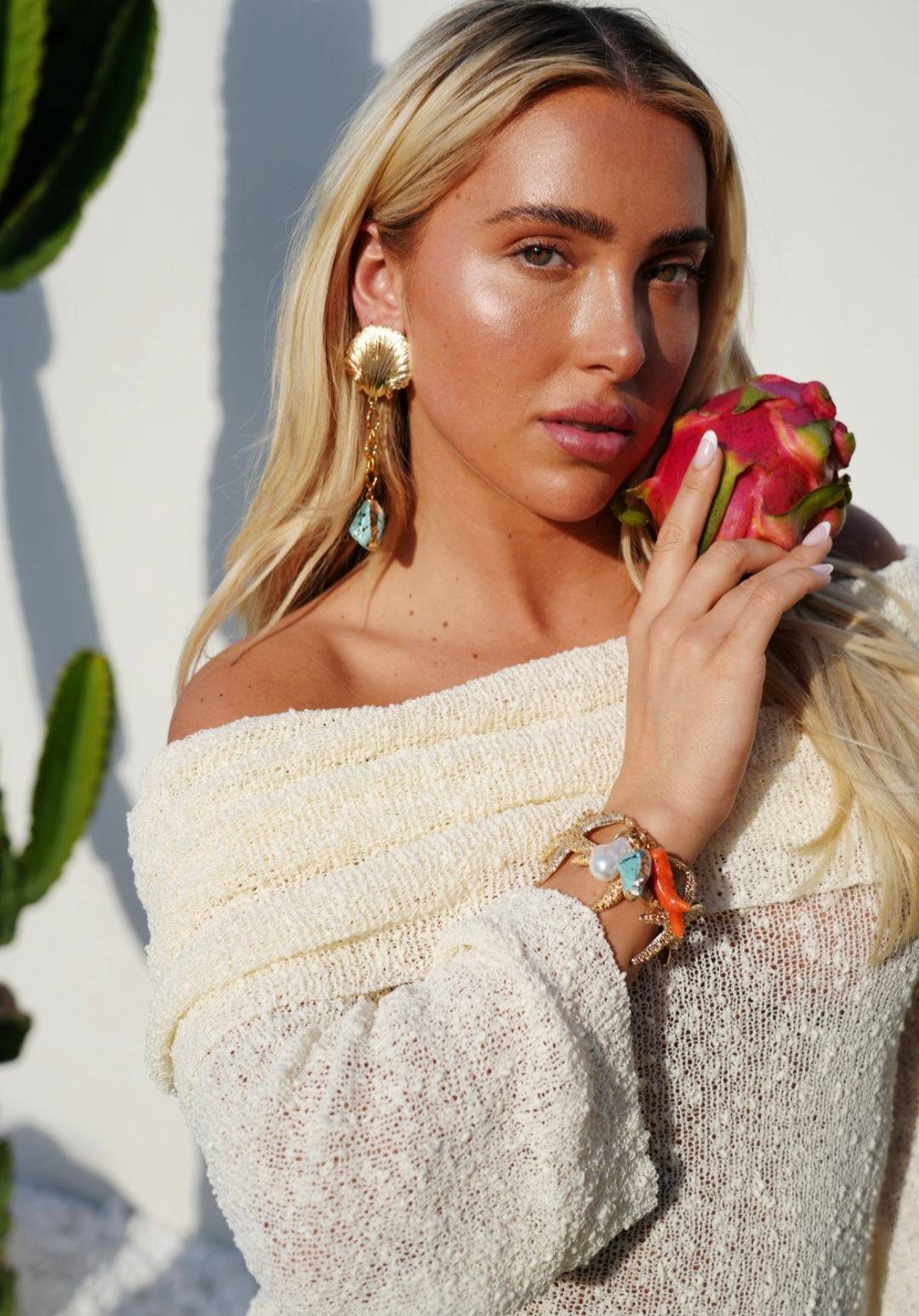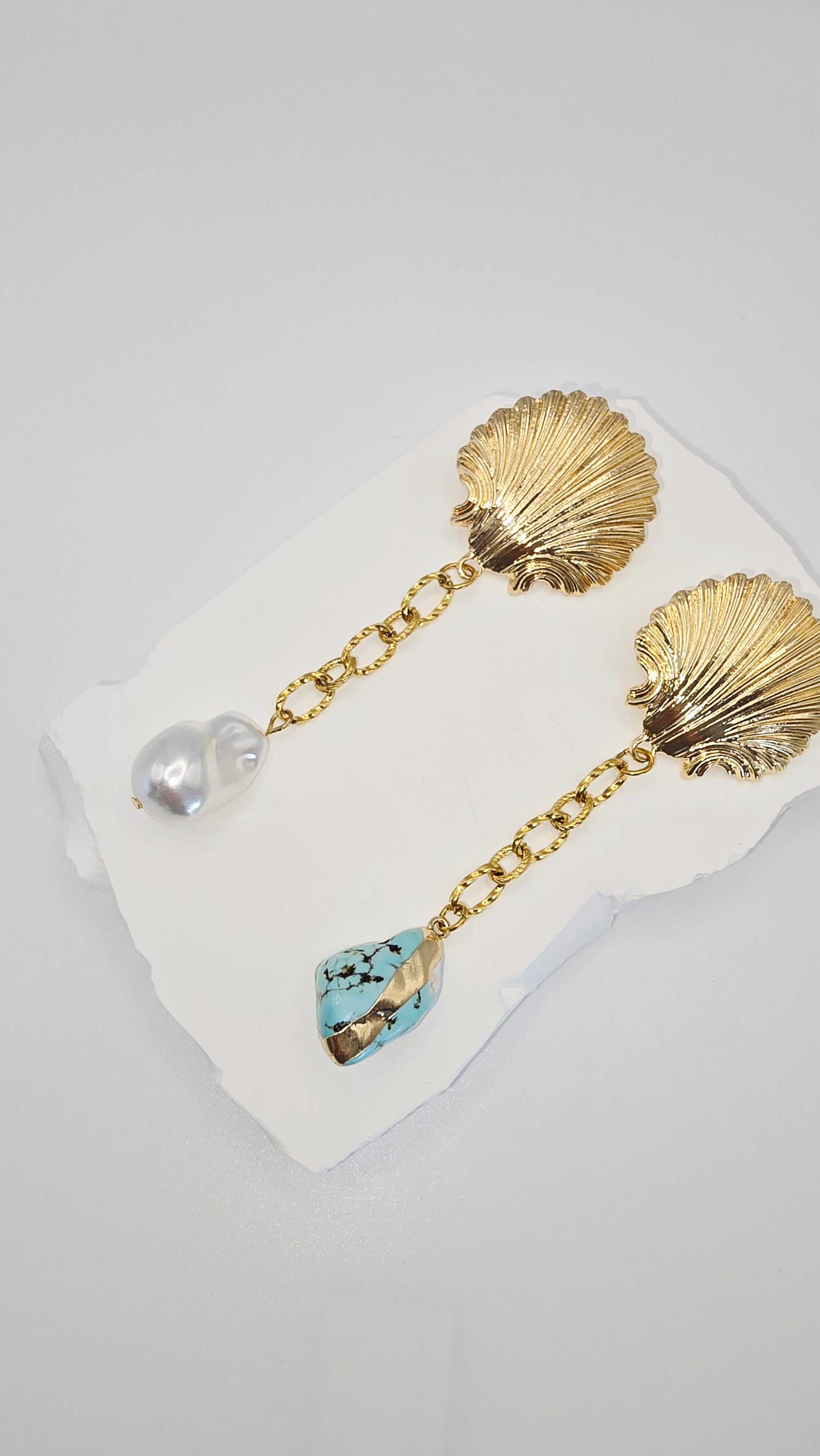 The sea’s treasures, reimagined. The Paloma Earrings feature sculptural golden shells that cascade into mismatched drops — one adorned with raw turquoise, the other with a luminous pearl.