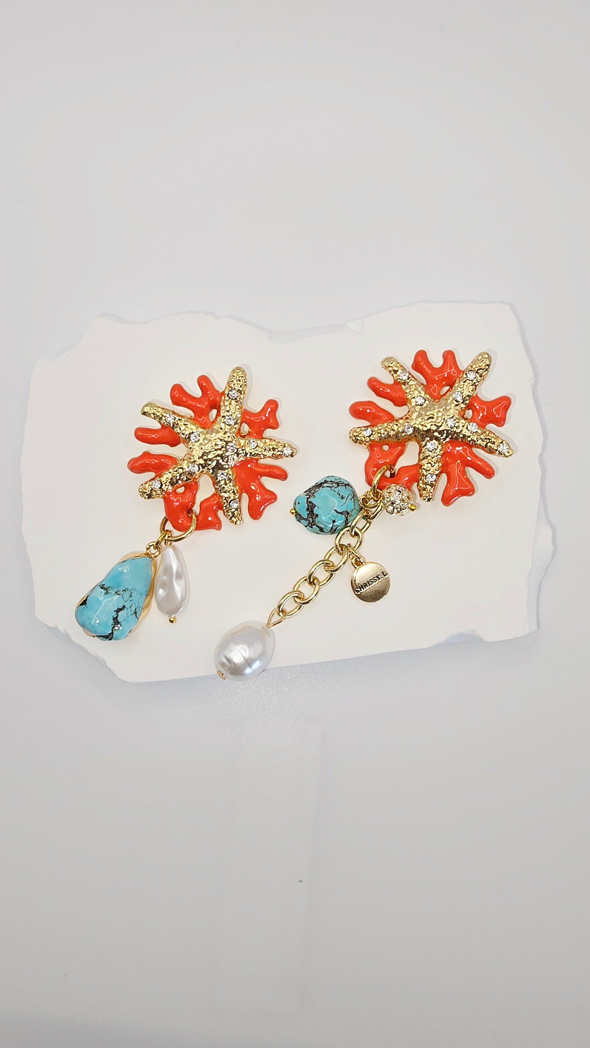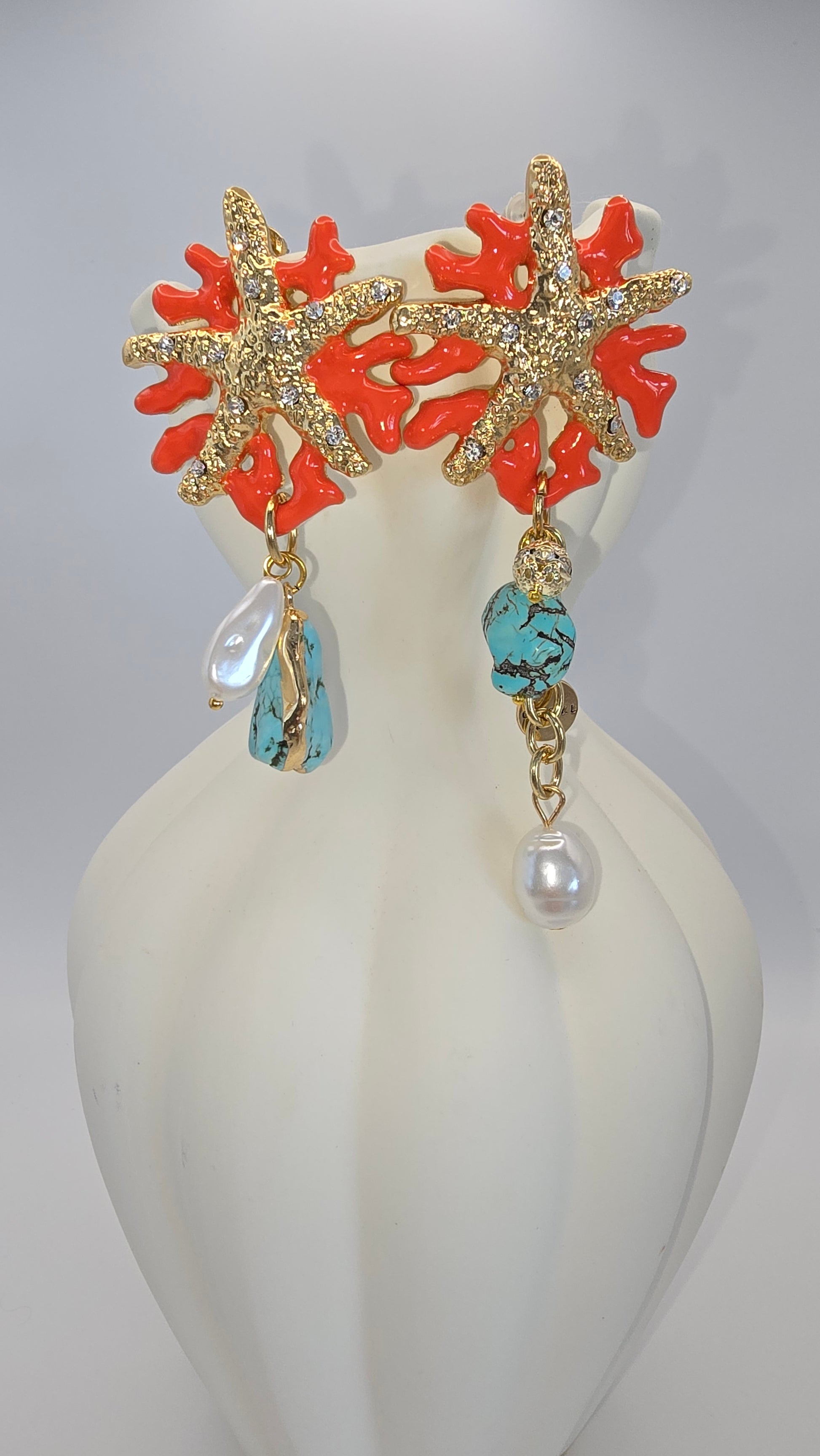 Golden starfish sparkle against vibrant coral, while drops of turquoise and baroque pearls cascade like treasures gathered from the Mediterranean. Each earring is uniquely balanced — one pairing turquoise with a luminous pearl, the other layering turquoise with a golden chain and pearl drop — creating a statement that’s effortlessly chic and editorial.