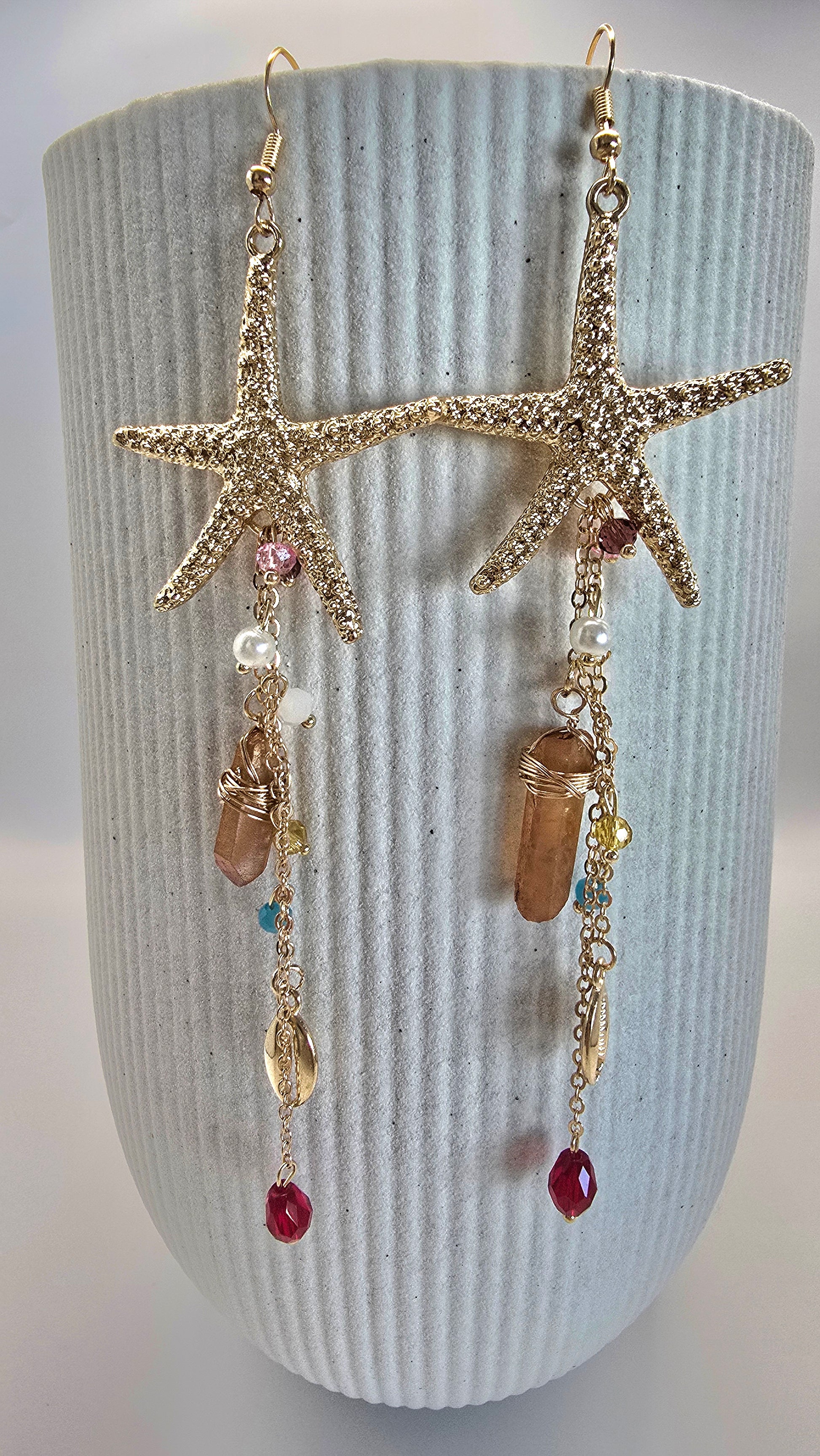 Where the sea meets the sparkle. The Star Dreaming earring is your golden-hour ticket to summer seduction. Featuring a hammered gold starfish and cascading chains adorned with coral, turquoise, pearls, and shell-inspired charms, this piece channels the energy of barefoot glamour and coastal escapes.