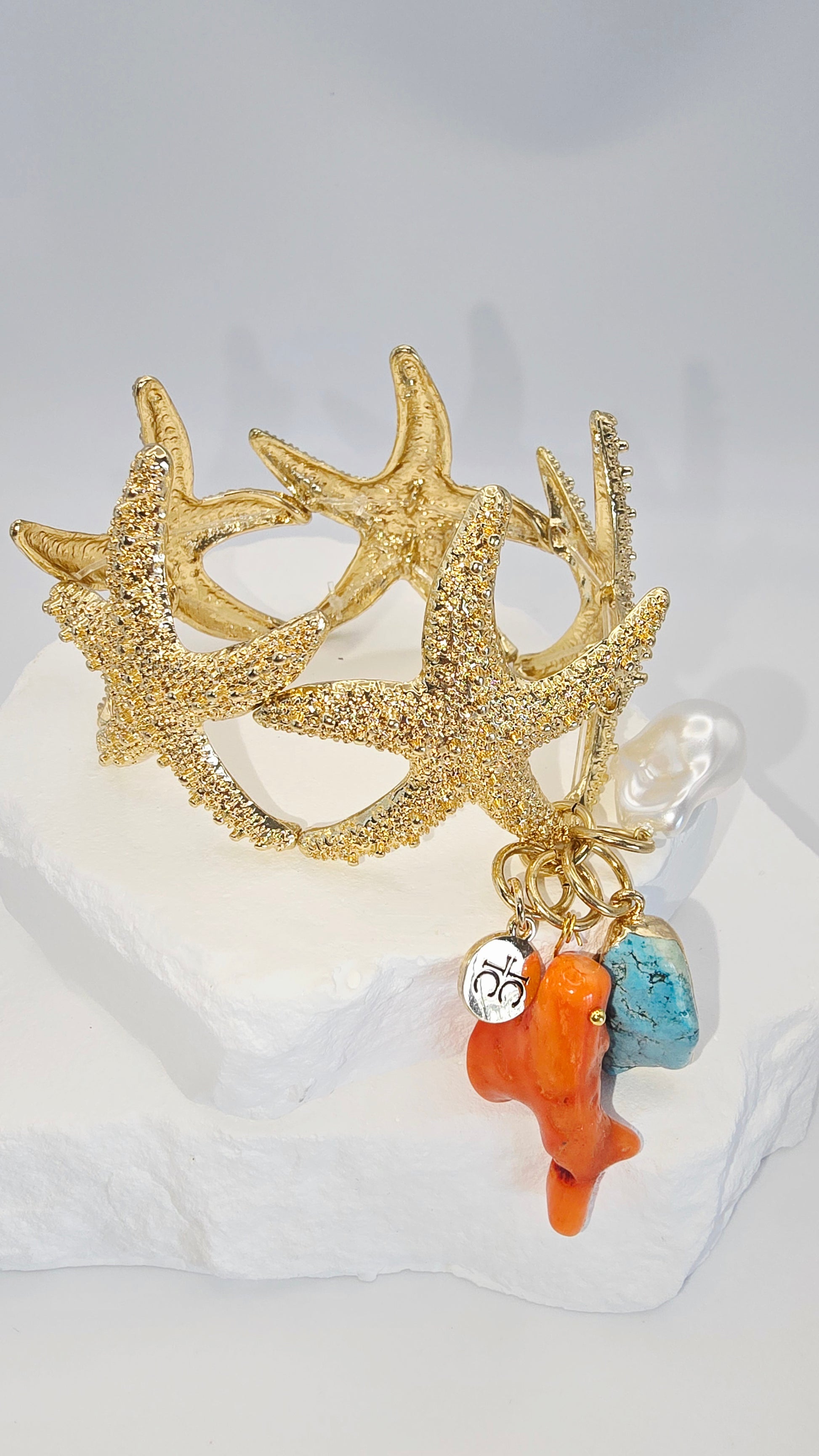 Radiant, bold, and full of coastal glamour—the Starluxe Bangle is a statement piece that feels like it was made for golden sunsets on the Riviera. Sculpted in textured gold starfish, this stretch bangle slips on effortlessly while shimmering with playful movement.