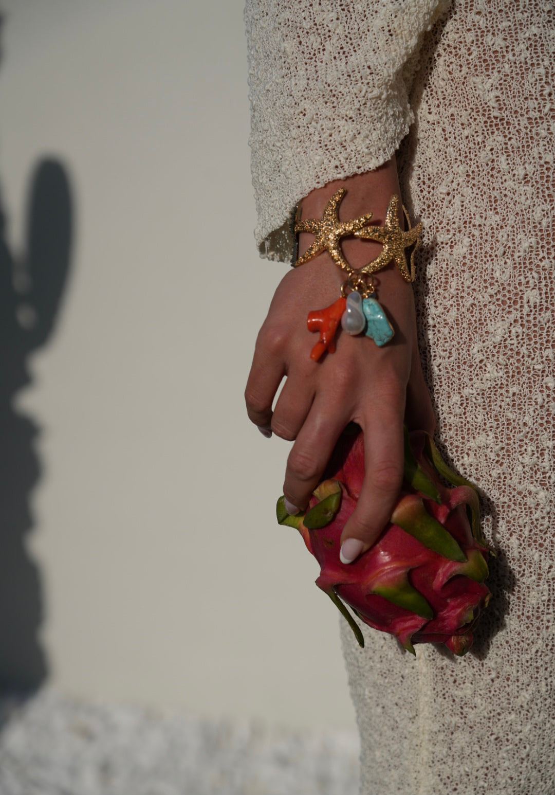 Adorned with Mediterranean treasures—a turquoise nugget, lustrous baroque pearl, fiery coral, and hammered gold charm—each detail celebrates the vibrant spirit of the sea. Designed to sparkle from beachside cocktails to late-night dancing, it’s the ultimate Chrissy L piece for those who live life like it’s always summer.